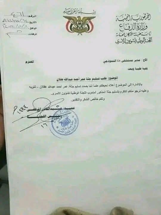 وأكد تقرير طبي صادر عن مستشفى 48 أن الدكتور عمر أحمد عبدالله السامعي توفي بتاريخ 11 يونيو/حزيران 2020، دون إخطار أسرته بالواقعة طوال السنوات الماضية.
