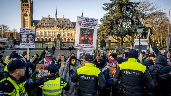 خرج عدد كبير من المتظاهرين بملابس حمراء سائرين في شوارع لاهاي الأحد لمطالبة الحكومة الهولندية باتخاذ مزيد من الإجراءات لوقف ما سموه "الإبادة" الجارية في